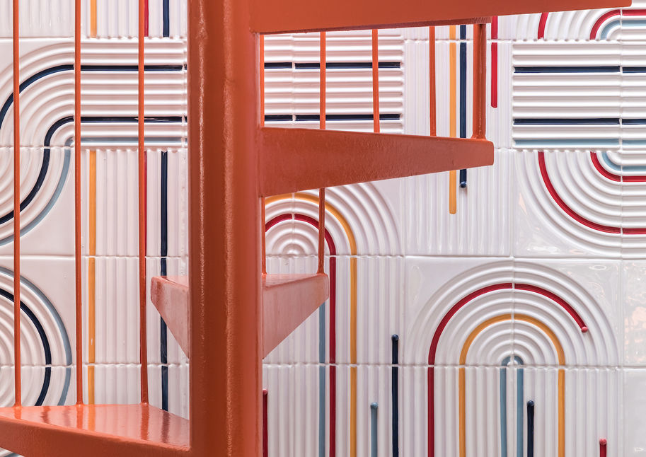 O destaque do projeto fica por conta do painel em azulejos exclusivos,que une os dois andares do apartamento, desenhados por Rodolfo Parolin, e pintados à mão por Rebeca Parolin, a paginação escolhida adiciona movimento e reflete personalidade dos moradores.